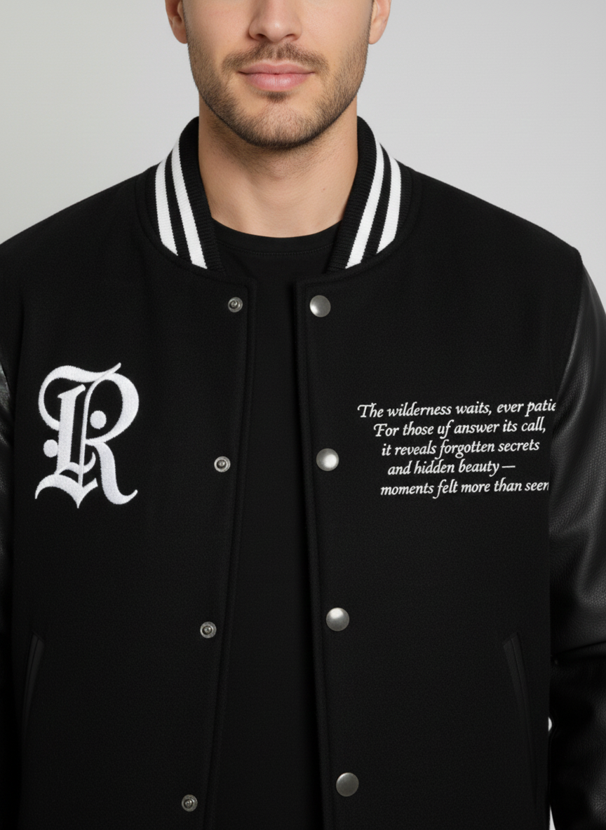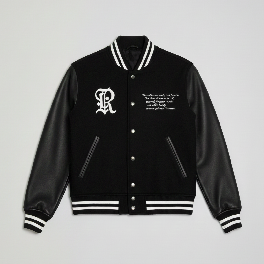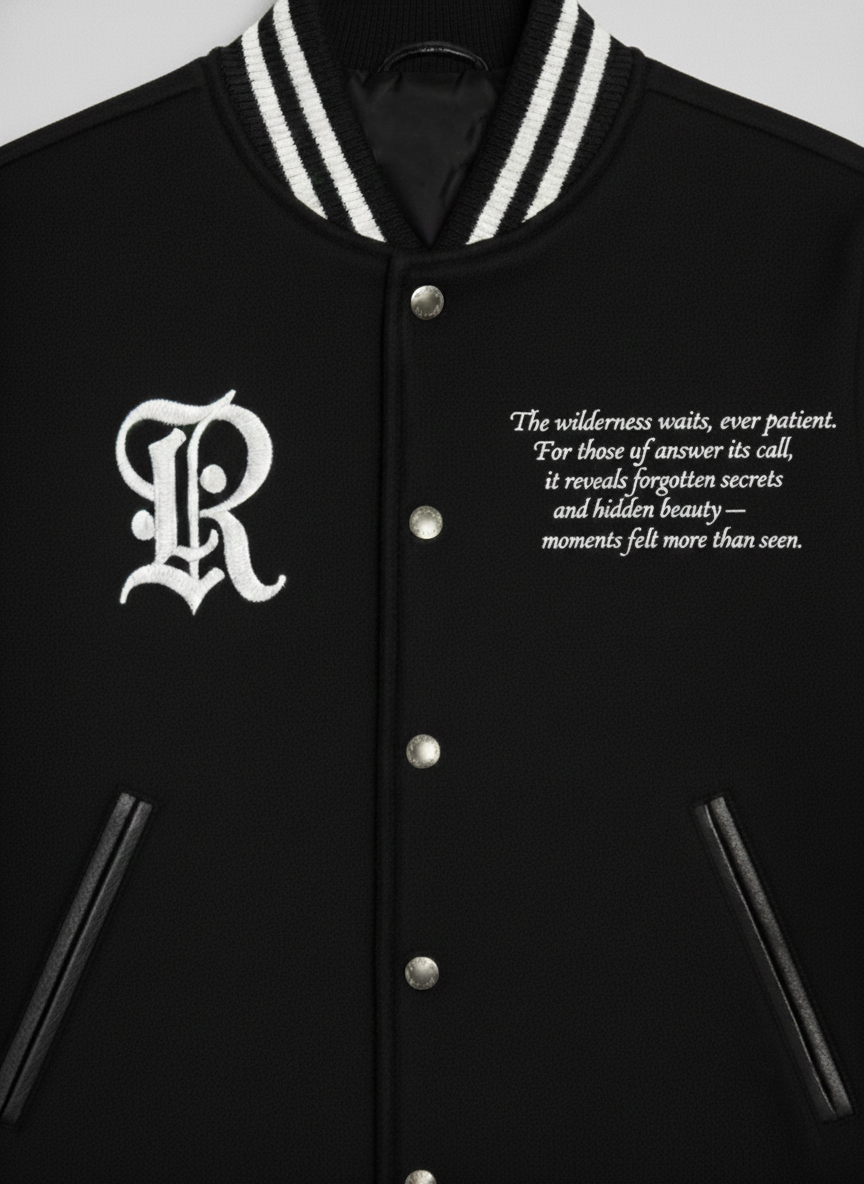 The front maintains a refined look with the signature white Rubail 'R' Logo and a short poetic verse embroidered on the chest (a nod to the image provided: "The wilderness waits, ever patient... moments felt more than seen."). Two zippered pockets ensure your essentials are always secure. This Rubail piece is designed for those who command attention without saying a word.