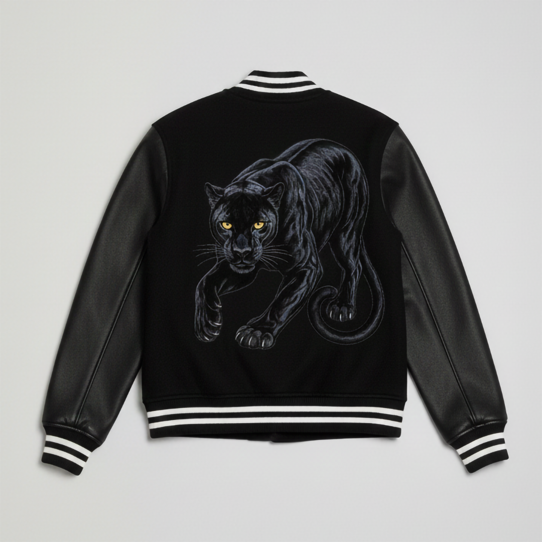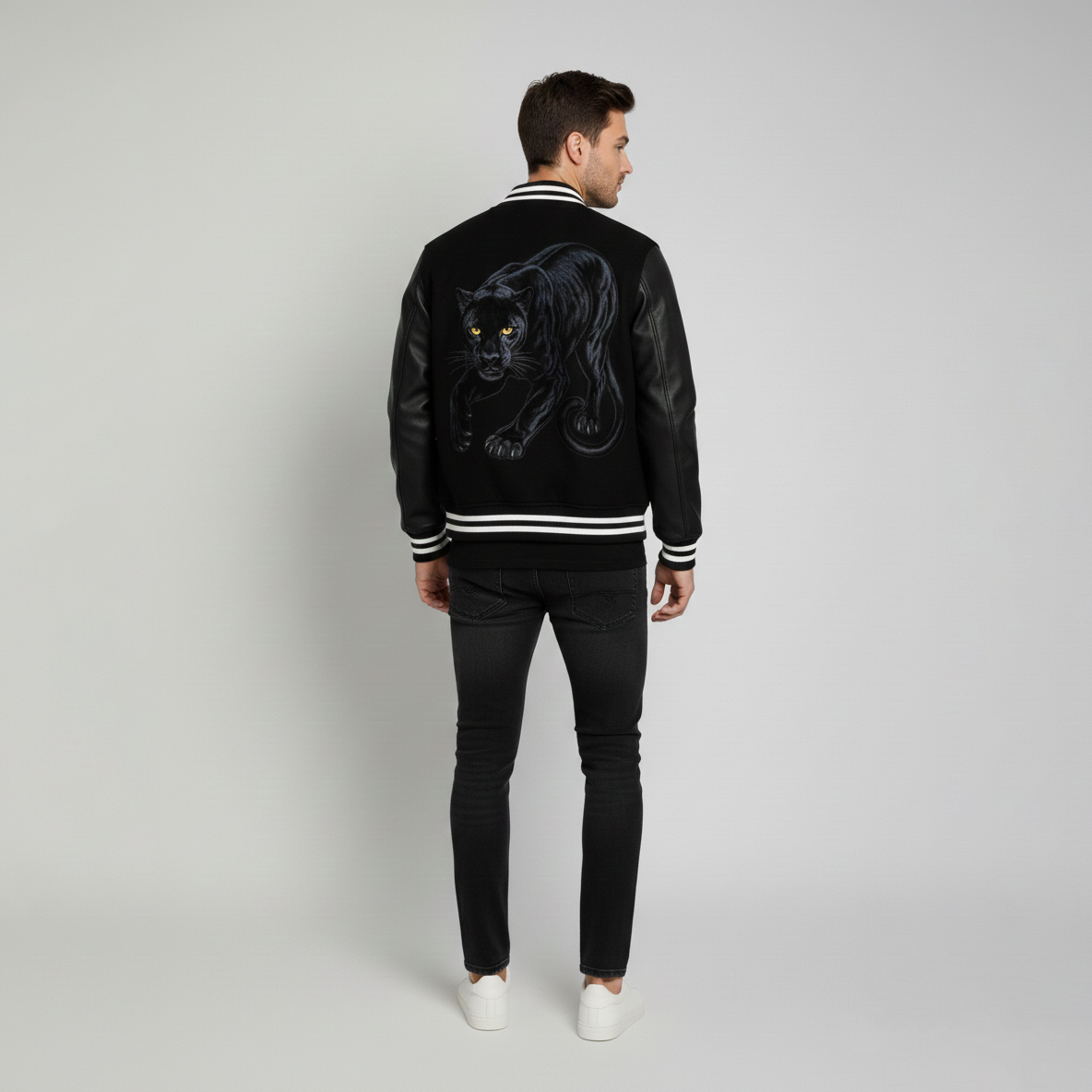 Capture the essence of the urban jungle with the Rubail "Midnight Stalker" Varsity Jacket. This luxury garment combines the timeless appeal of the classic letterman jacket with an intensely powerful graphic, making it an undeniable statement piece for your Rubail fashion line.