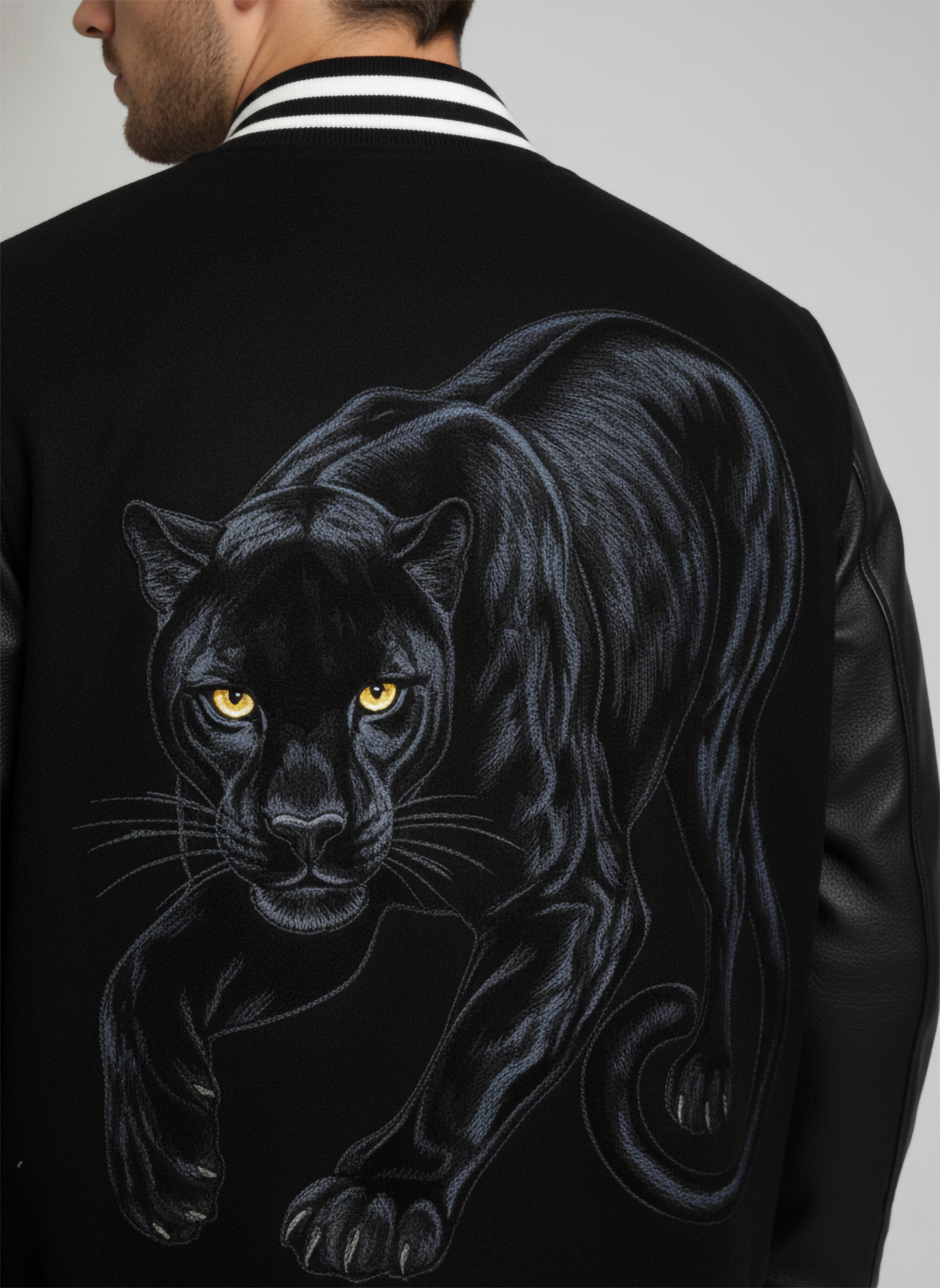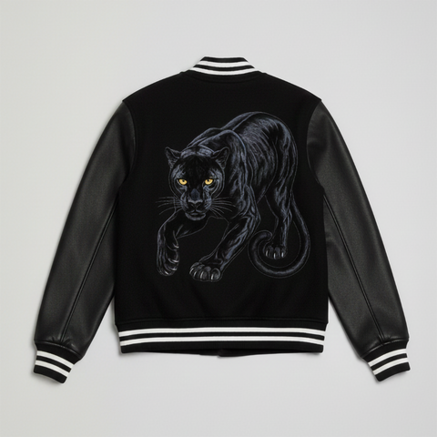 A striking, large Black Panther Graphic dominates the back. This high-definition embroidery features the majestic cat in a powerful, prowling stance with piercing yellow eyes, adding incredible depth and a fierce, regal character to the jacket.