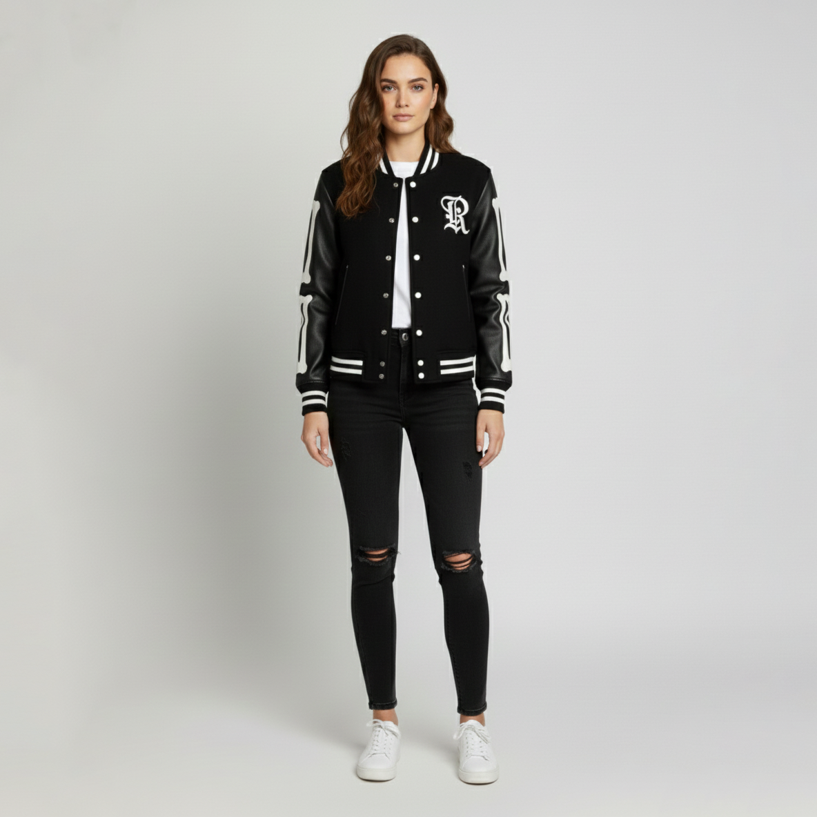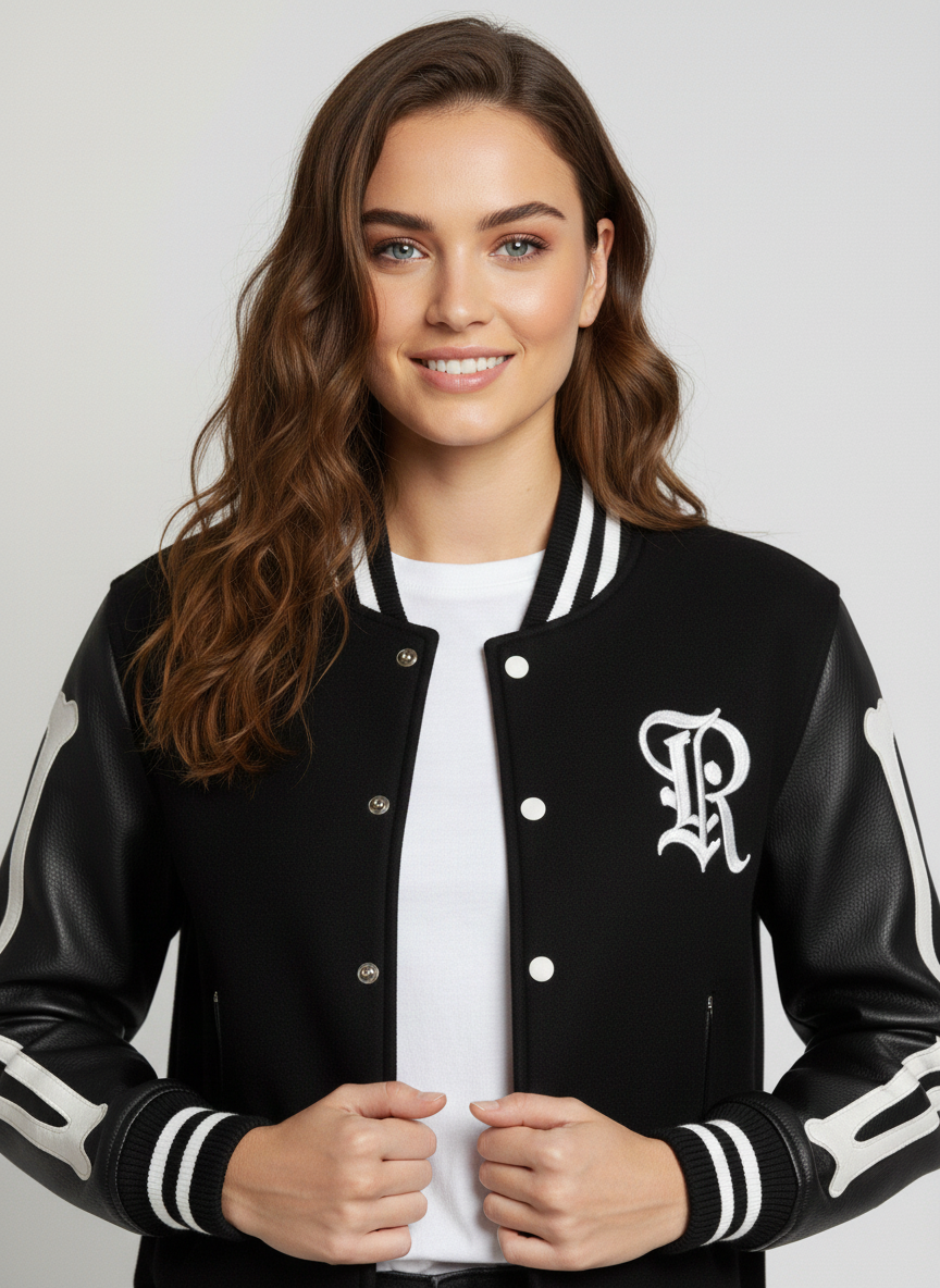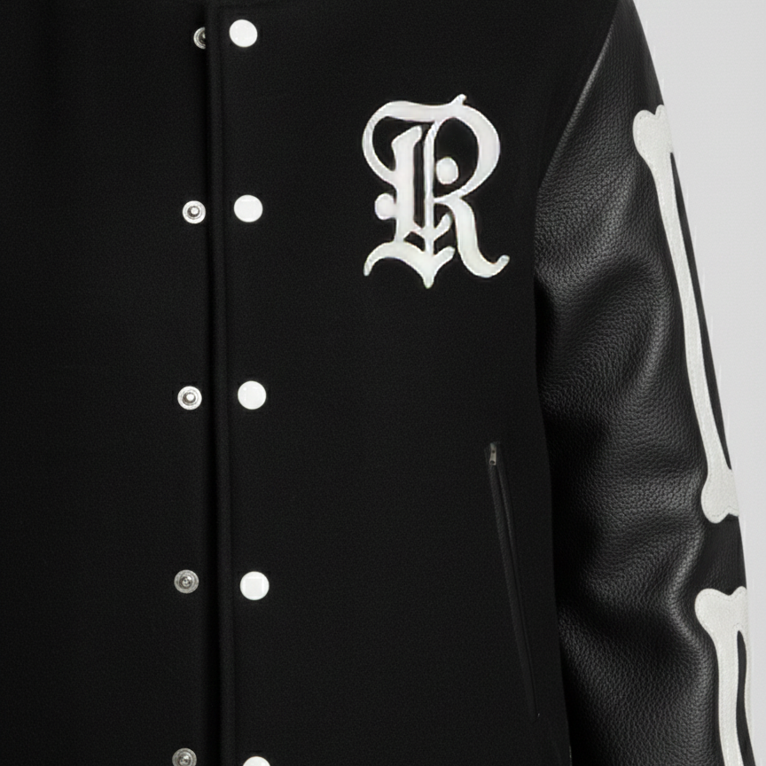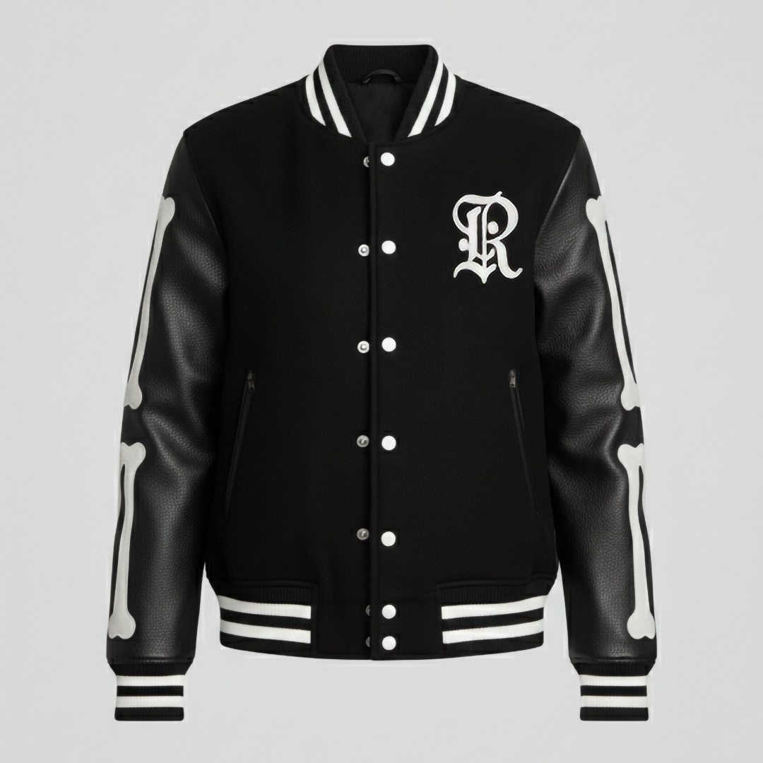 Distinctive Bone Sleeves: High-contrast white bone graphics on the black leather sleeves ensure maximum streetwear impact.