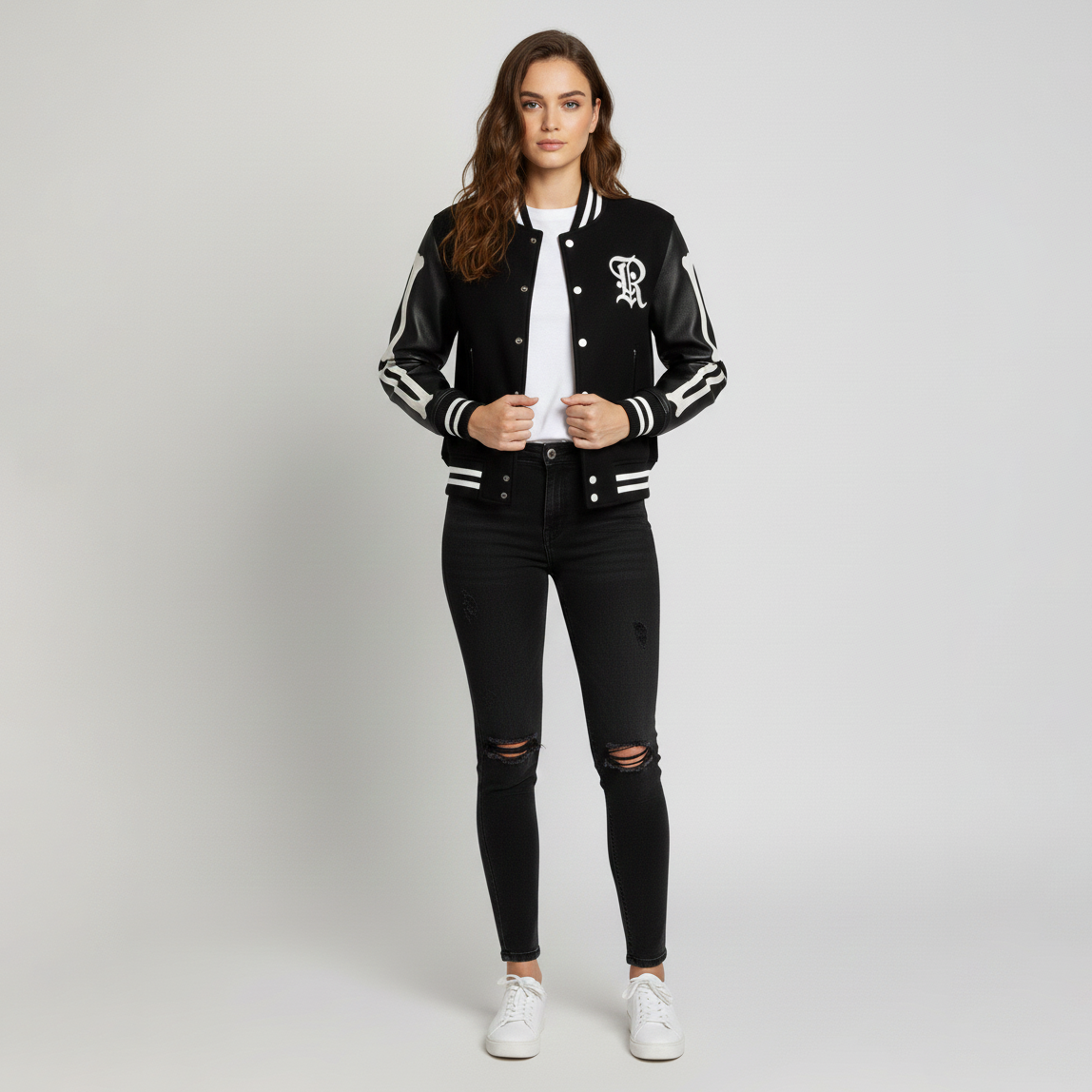 The body features a rich, insulating Wool Blend fabric, while the sleeves are crafted from sleek, durable Cow Leather. This timeless contrast is amplified by the dynamic Bone Graphics running down each sleeve, providing an immediate, high-contrast streetwear aesthetic.