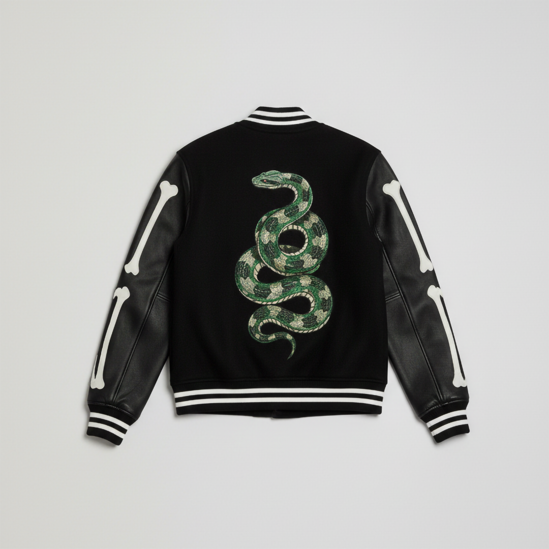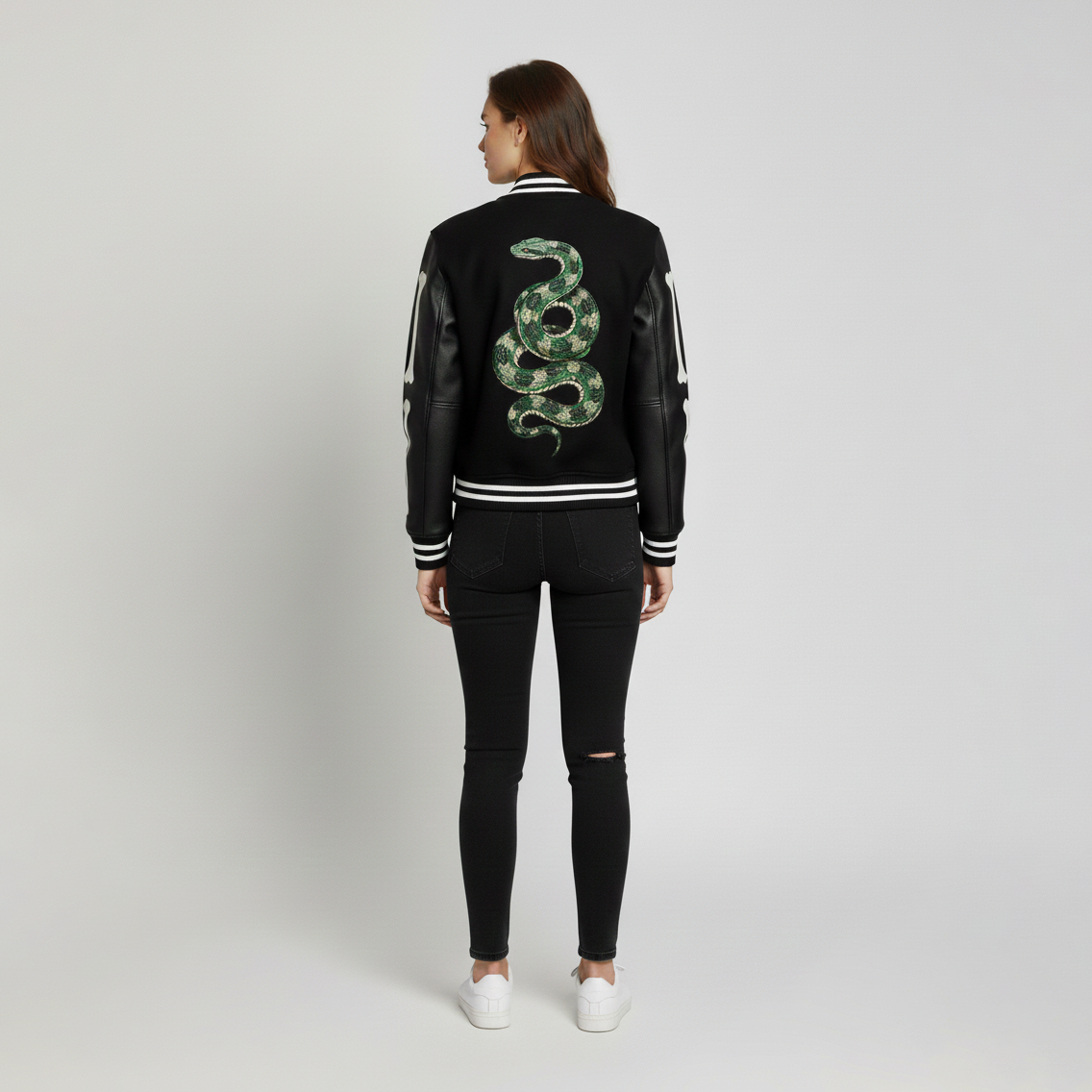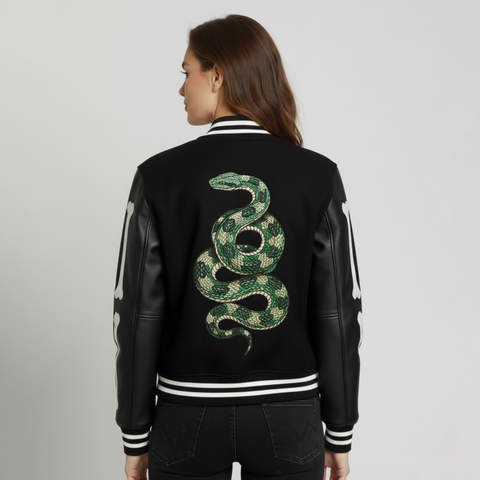 Rubail Black Wool & Leather Varsity Jacket with Embroidered Viper Snake and Bone Sleeves