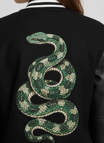 Masterful Snake Back Embroidery: Features a detailed, multi-toned viper snake, adding an intricate, luxurious, and bold design element.